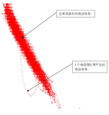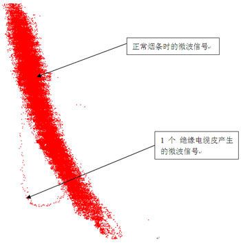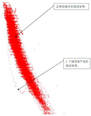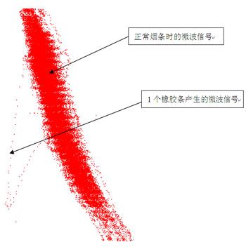 各種物質(zhì)在經(jīng)過微波諧振腔時(shí),微波檢測信號(hào)點(diǎn)都不一樣,通過對正常煙絲的微波信號(hào)和各種異物微波信號(hào)不一致的分析對比,我們就可以實(shí)現(xiàn)卷煙機(jī)煙支內(nèi)橡膠、塑料等各種異物在線檢測功能。