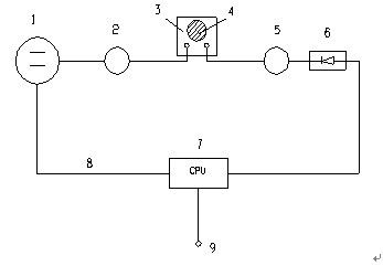 1為微波發(fā)生器;2、5為隔離環(huán);3為諧振腔;4為被測(cè)煙條; 6為檢波放大器;7為數(shù)據(jù)處理器;8為微波發(fā)生器的控制線路;9為輸出信號(hào)。